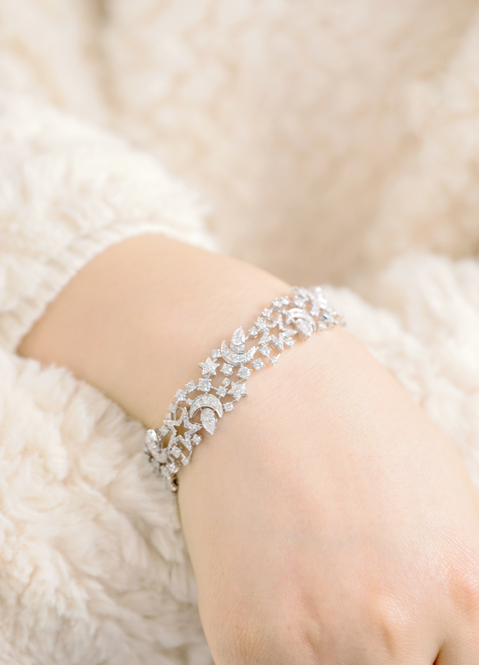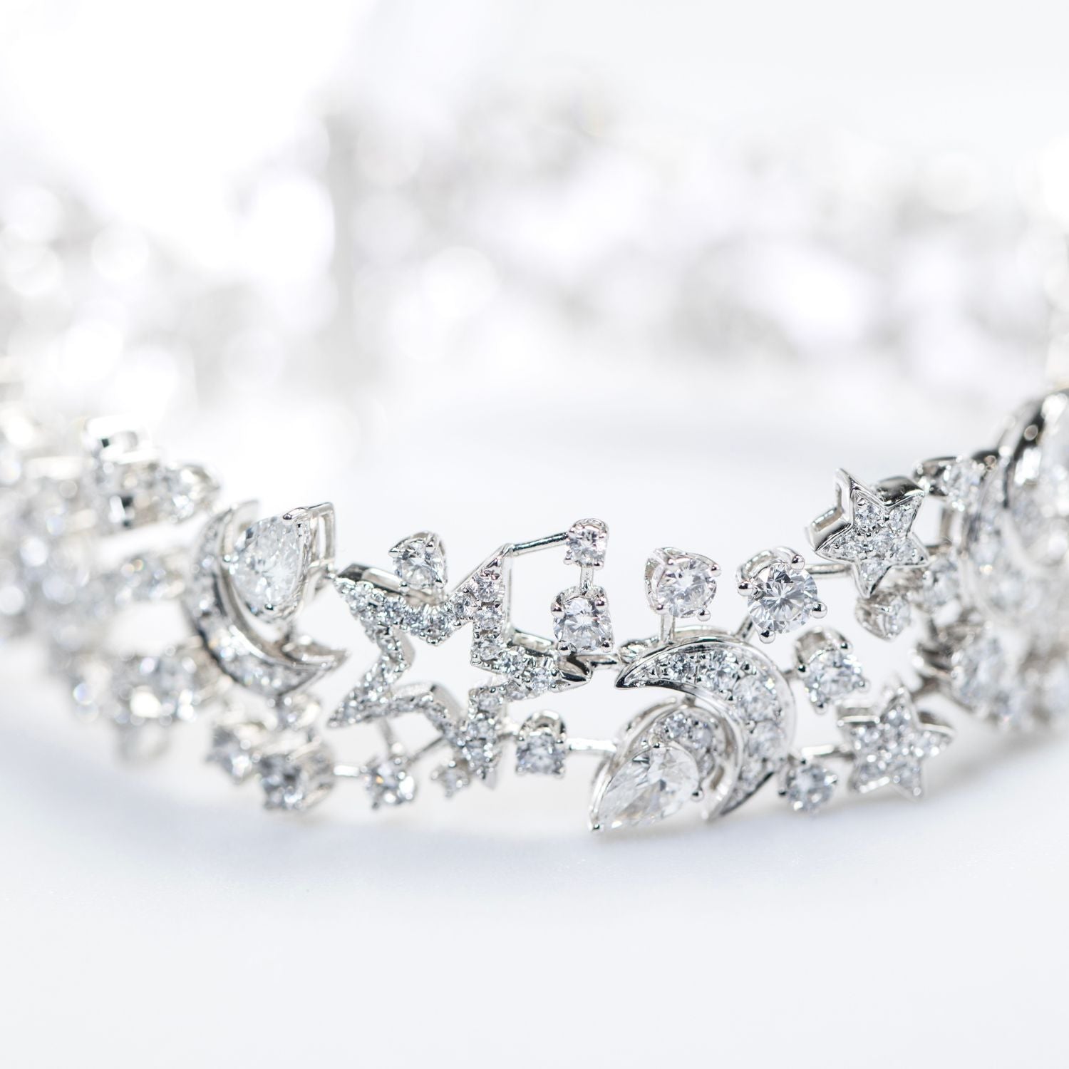 Drawing inspiration from the luminous glow of the moon and the shimmering light of distant stars, this bracelet is a constellation of twinkling stars and a solitary moon, elegantly linked by the brilliance of diamonds. At a mere glance, the interplay of light and design is captivating, as if the stars and moon are in a silent, harmonious dialogue.